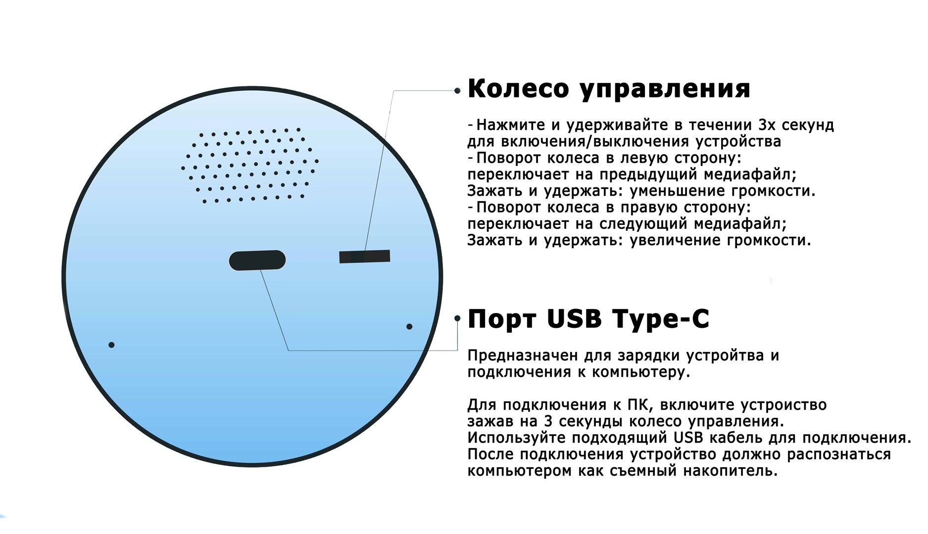 Устройство имеет инновационный дизайн круглой формы, включает технологию 3D дисплея и возможность воспроизведения персонализированных аудио и видео файлов.