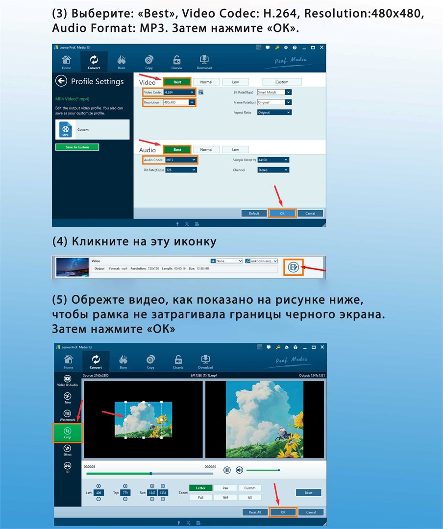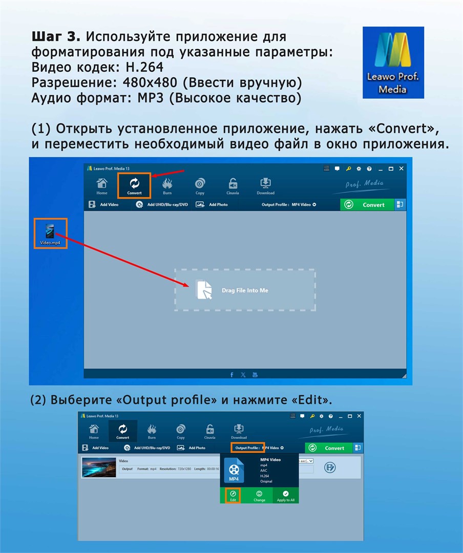 Видео: Поддержка видеофайлов формата MP4 в разрешении 480х480px. (Рекомендуем использовать комплектное ПО для перекодирования.)